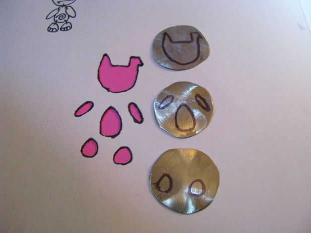 Con un bolígrafo traza las formas del monstruo con una presión moderada. Esto hará que las piezas a cortar de papel con una plantilla. Rastrear las formas en los níqueles rotos.