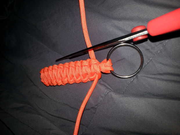 Paso 1: materiales ·2 1/2 pies de paracord o cadena similar· clave o claves·Nut, lavadora o cualquier otro objeto con un orificio de al menos 2 mm de diámetro·scissors·LighterPaso 2: a partir de Tomar un extremo y poner a través del orificio de las t