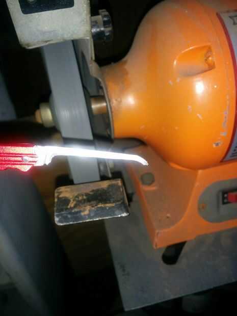 Cuando era más o menos la forma que quería, era tiempo para moler más fino. Yo había escogido la parte posterior del cuchillo que mi selección, y que es donde la hoja estaba mas gorda, así que tuve que moler se V muy en forma en una mucho más fina || forma. Lo hice moliendo poco a poco del lado de la hoja que no tiene la uña abertura divot (esto también pasó a ser el lado opuesto de mi plantilla demasiado)