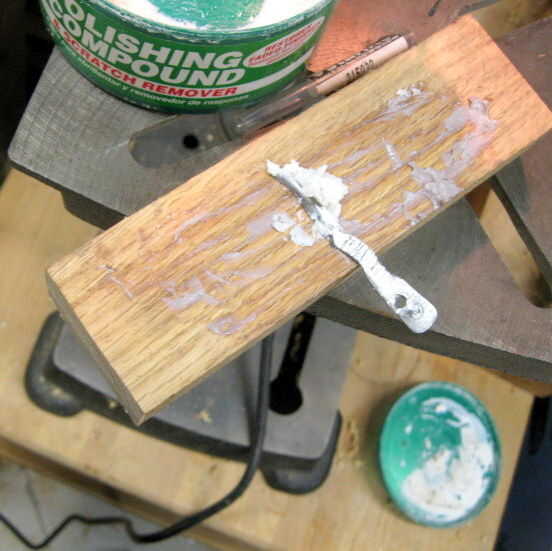 tengo un pulimento decente frotando el cuchillo en un trozo de madera cubierto de un fino roce (para un coche). En este punto la herramienta es pequeña y aguda, por lo que era bastante difícil de manejar.