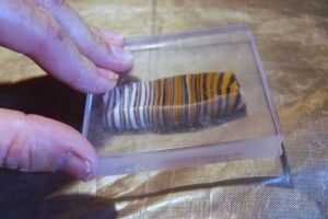 Ahora corte un 2 pulgadas parte de su rodillo de la serpiente y usando el acrílico estampado bloque o una pieza de vidrio o una jarra de fondo plano, romper su arcilla, agradable y plana. Debe ser aproximadamente de 3/8 de pulgada de grosor.