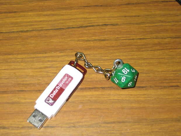 Llaveros baratos, hace un gran regalo. Ojos de tornillo, cadena y algo pequeño de su elección! He utilizado D20 de (calabozos y dragones y otros dados de RPG) para mis discos.