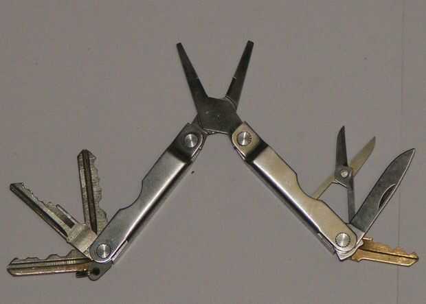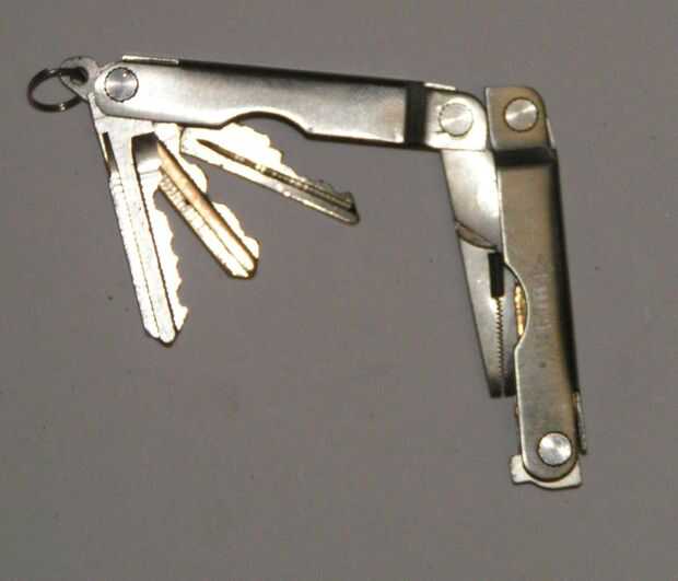 Volver a montar la herramienta de sustitución de las claves para las herramientas. Tenga cuidado con tres cosas. 1) seguro que poner una arandela entre el contacto metal sobre metal. 2) Asegúrese de que coloque la pieza de accesorio de llavero en algún lugar donde no interfiera con una clave. 3) más importante aún, recuerden dejar un hueco en el centro de cada lado para los alicates/cortadores para cuando colapsan la herramienta. (He puesto dos llaves hacia un lado, luego un montón de arandelas y luego una clave contra el otro lado.