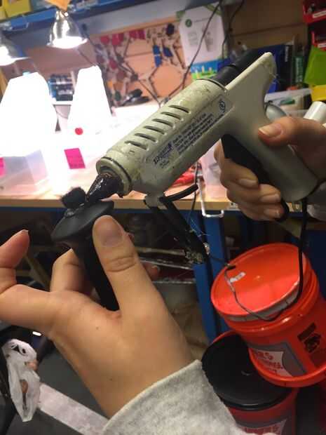 • Utilizando una pistola de pegamento caliente (o cualquier otro adhesivo fuerte) para poner pegamento en la brújula y pulse el velcro desechos brújula en la parte inferior de la vara de senderismo.