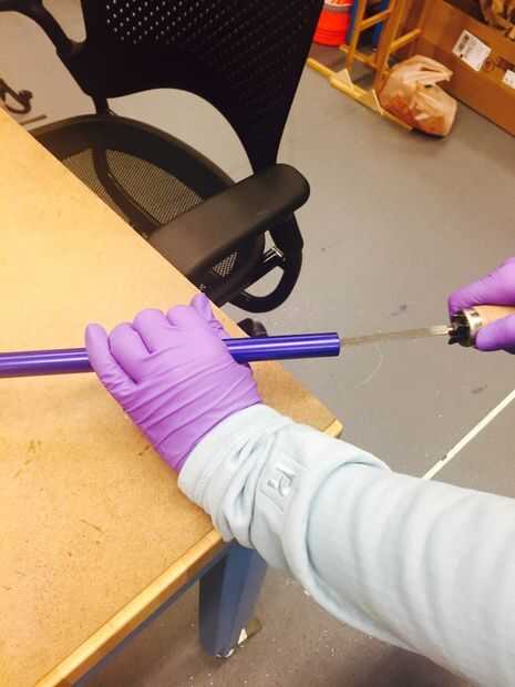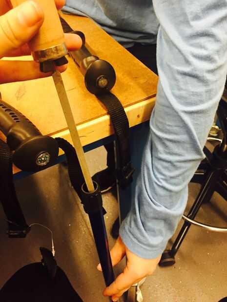En este punto tienes 2 ganchos doblados y el senderismo. El siguiente paso es utilizar epoxi para asegurar los ganchos para el polo de senderismo. Este paso de puntuación dentro del polo de senderismo será el mismo para usuarios en casa y tienda de máquina! Si tienes acceso a un archivo, funciona bien! Papel de lija es otra buena opción. También puede probar un cuchillo, tenedor o cualquier otro objeto punzante.