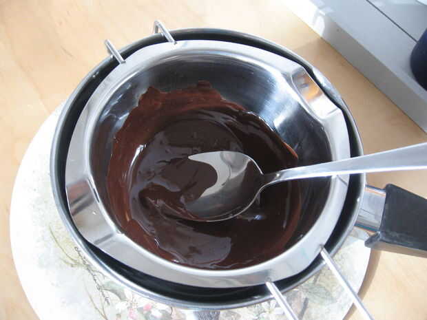 Para ello, hervir agua en una sartén y poner un recipiente con el chocolate en el agua caliente. La parte difícil es que realmente necesita tener cuidado de no gotear agua en el chocolate fundido, porque hace que el chocolate se solidifique (irreversible). Este método es muy útil, especialmente cuando no tienes un horno de microondas (ver las imágenes con chocolate negro).