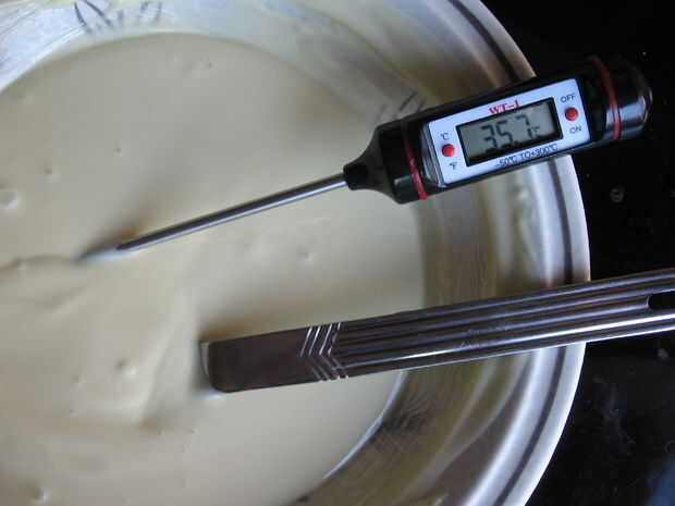 Cada ahora y entonces usted necesita sacar el chocolate durante la medición de la temperatura, hasta llegar a la temperatura crítica. Si no quieres esperar también podría agregar unmolten chocolate y fundirlo en el otro chocolate, de esta manera que la temperatura caerá más rápido.
