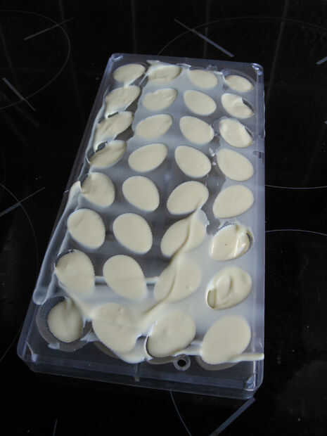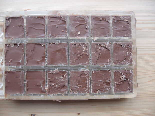 Limpie la parte plana del molde con el cuchillo de paleta. Verá que el chocolate se endurece mucho más rápido ahora, porque el molde sigue siendo frío. Tenga cuidado de no tomar demasiado tiempo para la parte inferior, de lo contrario no tendrá el tiempo de la raspar el chocolate sobrante antes de que endurezca.