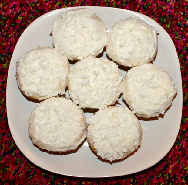 Sus magdalenas de crema lleno de hielo y cubrir con coco rallado.