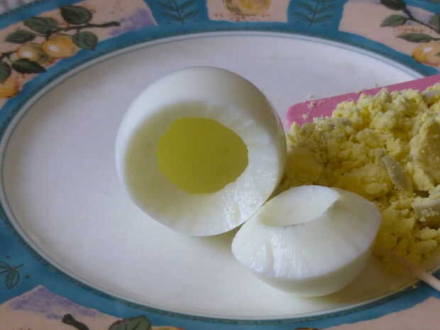 Retire con cuidado la yema y enjuague limpio. Utilicé un palillo de dientes para romper para arriba y el extremo posterior de una cuchara para sacar unos pedacitos a la vez. Si la pared es demasiado fina, sólo ahorrar ese huevo para otro uso.