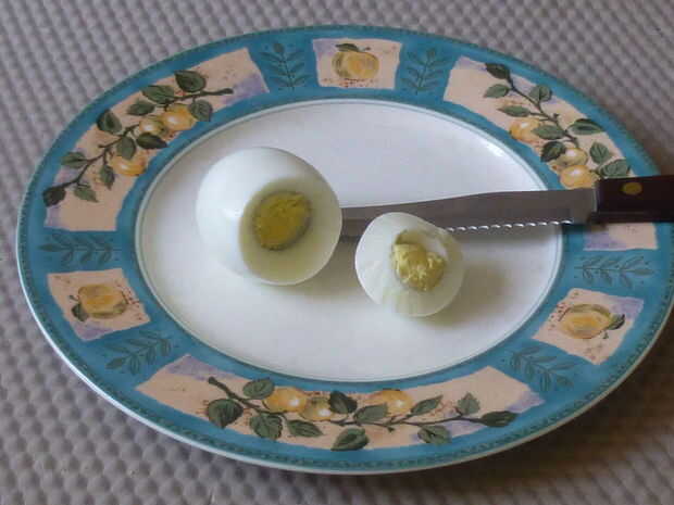 Corte una clavija en forma de cono en el extremo estrecho. Corte sólo como usted empuje el cuchillo (movimiento delantero) para evitar rasgar el huevo.