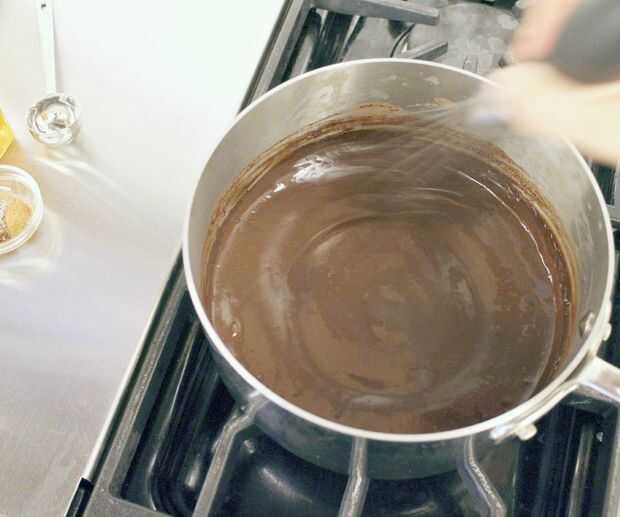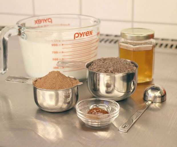 En una olla de tamaño medio medio-alto med, agregue la taza de beber chocolate piezas. Una vez que comienza la fusión, batir lentamente en el cacao y especias, seguidos por la miel y la leche. Añadir la leche solamente 1/4 taza a la vez para evitar la aglutinación de chocolate.