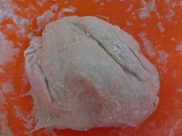 Mezcle la harina, agua, levadura y sal en la mezcla del tazón de fuente y amásela 8 - 10 veces. Luego verter el exceso de harina y poner en el tablero de corte.