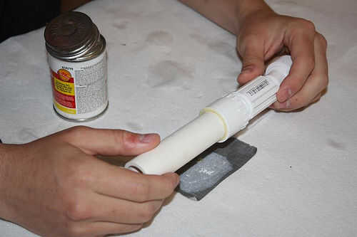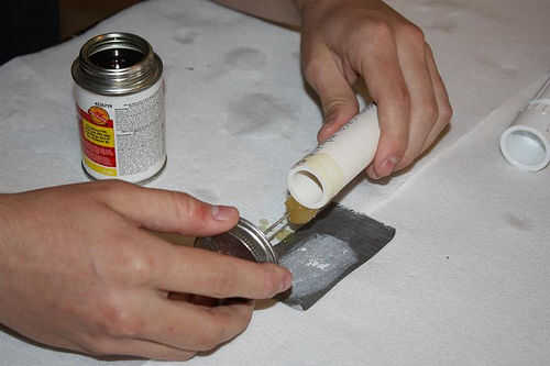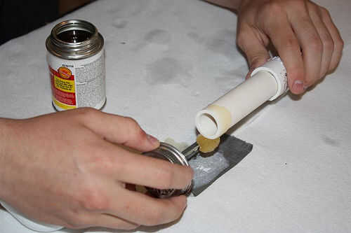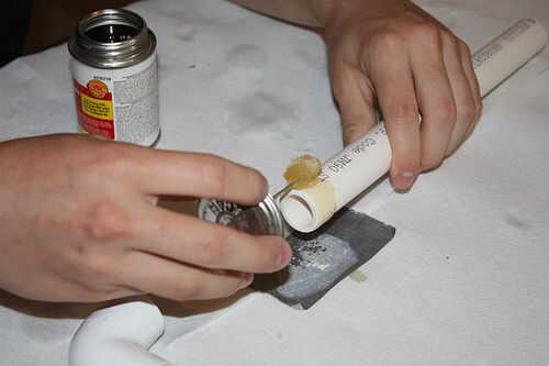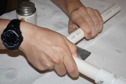 Si la prueba de ajuste es el tamaño correcto, seguir adelante. Si no es así, cortar el vertical más corto o cortado uno más nuevo. Cubrir la superficie de trabajo con toallas o periódico para evitar conseguir cemento en él. Retire las juntas una a la vez y Aplique pegamento en el extremo en un movimiento circular. Al insertar el tubo en el accesorio, gire la tubería 1/4 vuelta. Sostener 30 segundos y limpie el exceso de cemento. Repita para las restantes articulaciones. Dejar para secar durante 2 horas antes de continuar.