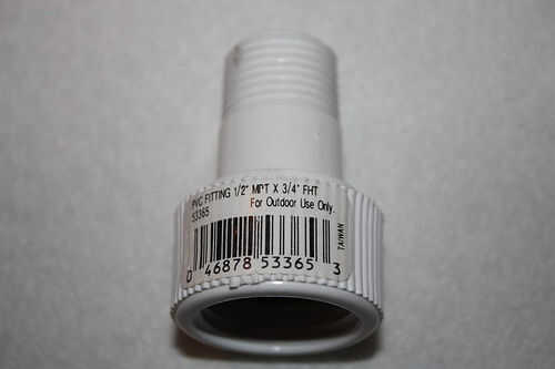 (1) manguera roscada al reductor de 1/2"(recomiendo utilizando un accesorio de latón, ya que es mucho más duradera. La parte giratoria tiende a pop de PVC unos).