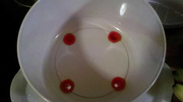 Taladrar cuatro orificios en la parte inferior de un recipiente de fondo plano. Los círculos rojos que ves son plástico pastel decorar boquillas que tenía de un proyecto que hice hace mucho tiempo. Después de taladrar los agujeros, puse un pequeño anillo de epoxy del dos partes alrededor del agujero y empujó hacia abajo sobre la torta boquillas de decoración hasta que se fijaron firmemente.