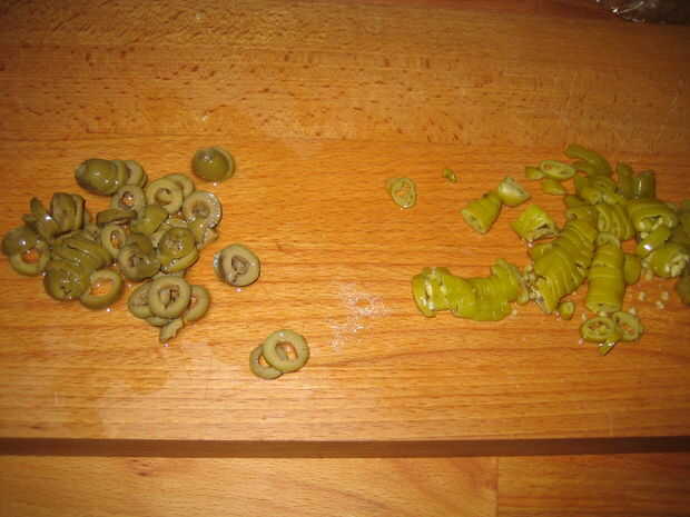 -corte las aceitunas y los pimientos en aros pequeños -Picar la cebolla -cortar los calabacines por la mitad y usar una cuchara para sacar sus "entrañas", para que tengan una ranura para la carne en