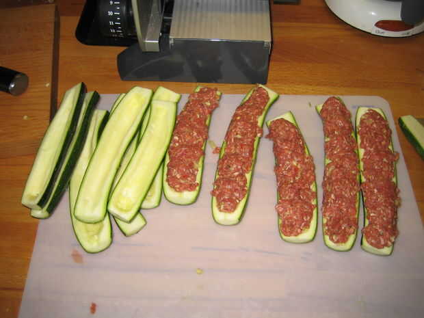 Dividí la carne con un raspador para tener una cantidad bastante igual de carne para reducir a la mitad cada calabacín.
