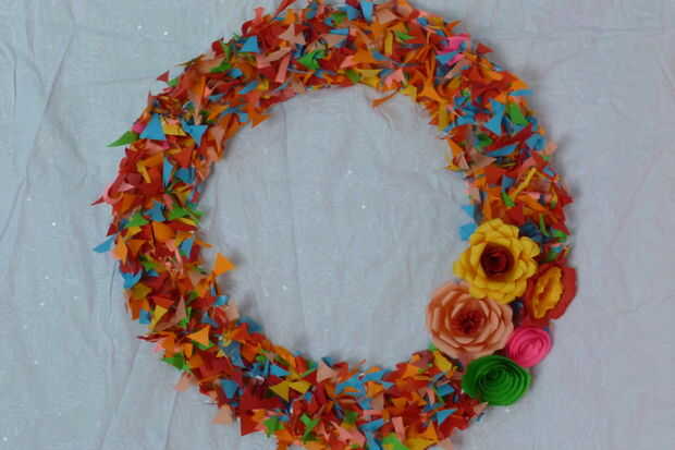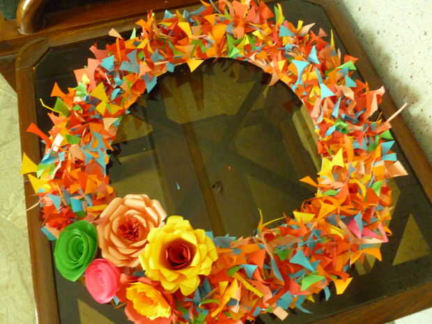 sólo pegar los papeles en la wreatjh... BC i dnt hav cualquier guirnalda para cur el cartón en forma redonda n pega todos los papeles en una forma áspera de v,, yhen ven tan bonitos