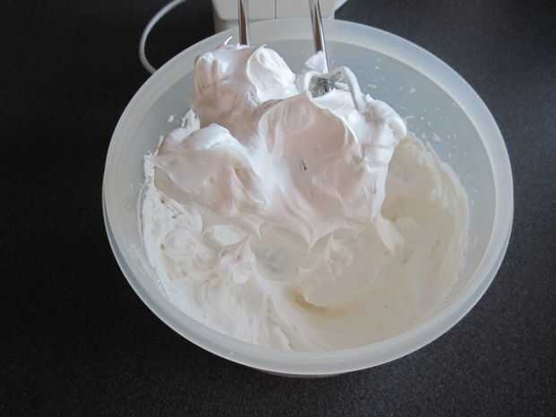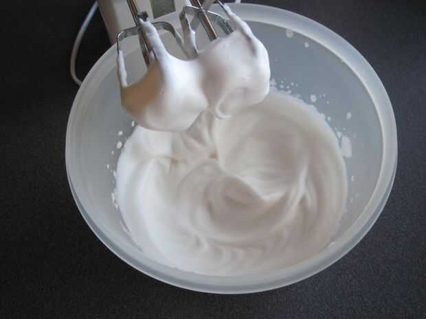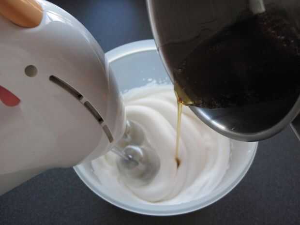 Cuando los huevos han alcanzado picos suaves, lentamente Vierta el jarabe caliente y mantener azotes hasta picos muy firmes, unos 10 minutos.