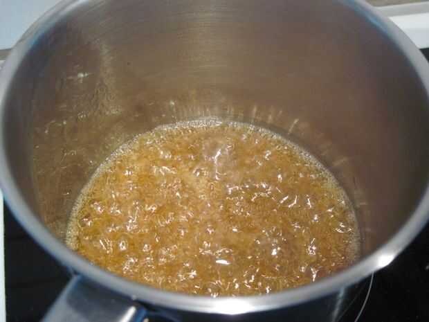Mientras tanto, poner el almíbar a hervir y dejarlo cocer a fuego lento durante unos minutos.