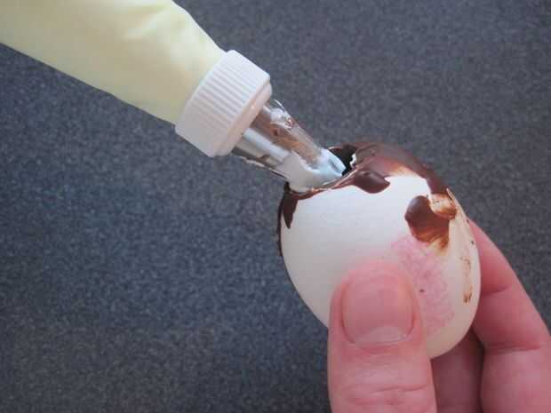 Cerca de los huevos verter chocolate templado un poco en el agujero en la apertura del huevo. Coloque los huevos en la bandeja del huevo en el refrigerador hasta que el chocolate se haya endurecido.