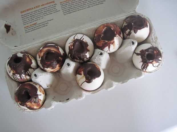Hacer el jarabe de regaliz mezclando 2 cucharaditas polvo de regaliz con jarabe de oro 75 g. Poner el jarabe en otra Manga pastelera con una punta redonda pequeña, la punta del palillo en la pelusa de la melcocha en los huevos y la pipa en un jarabe de regaliz. Como alternativa, utilizar mermelada o crema de limón en lugar de jarabe de regaliz. Rematar con pelusa de la melcocha más hasta que los huevos están llenos.
