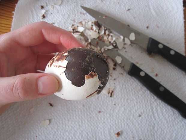 Usando un cuchillo afilado, cortar el chocolate en exceso alrededor del agujero en la parte inferior de los huevos. Empezar a pelar las cáscaras de huevo con el cuchillo o los dedos (si no te importa conseguir piezas afiladas de cáscara de huevo debajo de las uñas).