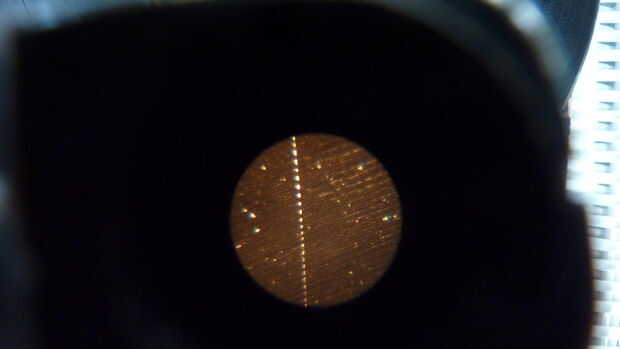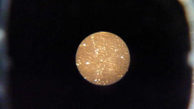 La segunda imagen microscópica muestra un cero más pequeño también, pero también muestra muchas deformaciones en los bordes y lados de los surcos. Cuando este álbum fue muy popular, tono brazos y agujas eran pesadas y grandes. Como corrieron a través de las ranuras, la aguja acumulan calor, ablandar el plástico, por lo que el vinilo más propenso al daño. Una aguja grande no cabe en la ranura, para que quede en parte, en los bordes exteriores de la ranura.