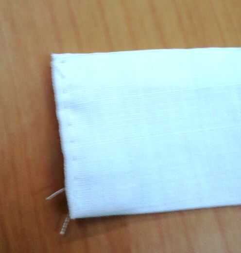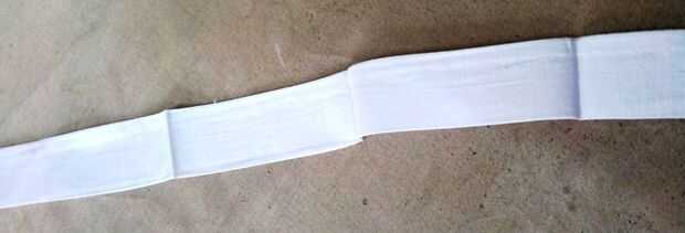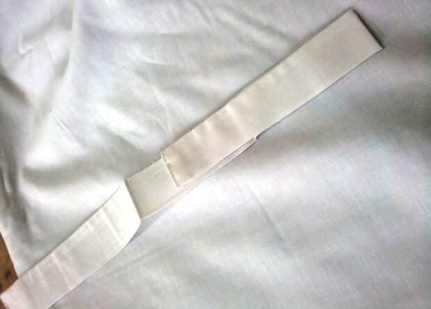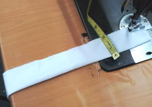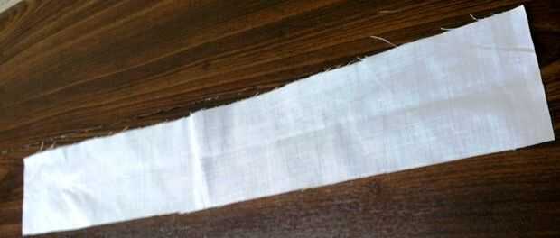 cortar 2 tiras del material de revestimiento alrededor de 3.25" de ancho y 22 pulgadas de largo. tomar una tira.. .fold longitud sabio... .iron y coser Tun se adentro hacia fuera y remeter los bordes y coser los extremos. doblar a la mitad y hierro. Marque 4" a cada lado del doblez de centro y doblar sobre esa marca y hierro.
