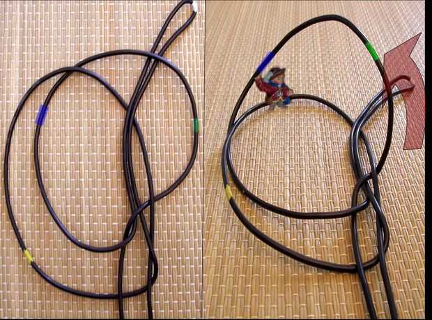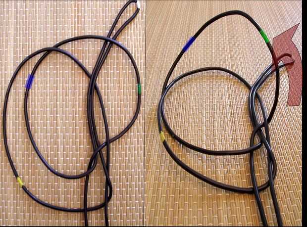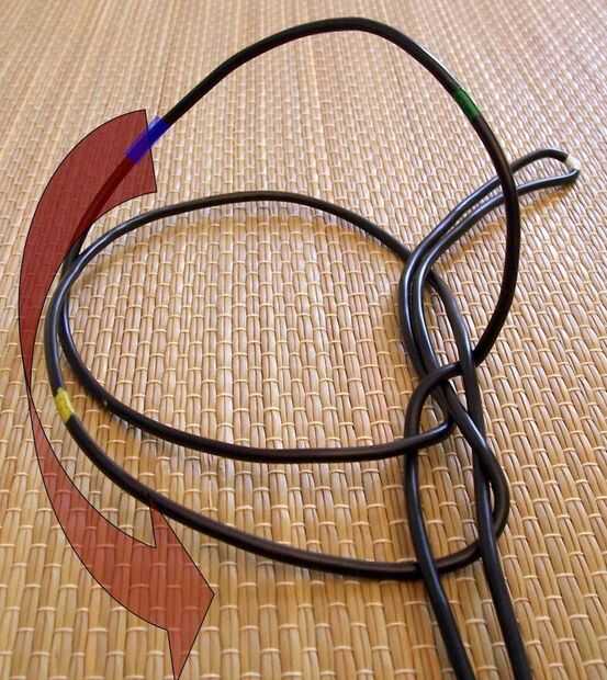 Levantar el marcador verde (situado en lo que antes era el lazo izquierdo) y tire de ella hacia abajo y hacia la derecha; Los bancos que en el frente del nudo.