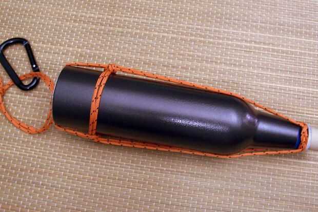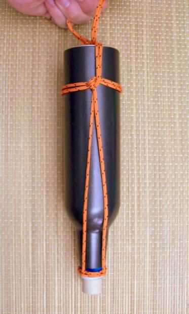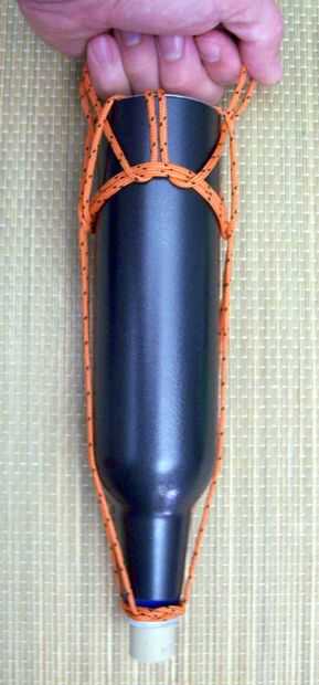Sin embargo los extremos corrientes del nudo se tiran hacia abajo hacia la parte inferior de la botella. Un Nudo de barril se ata aproximadamente 3/4 el camino hacia el lado de la botella. Un nudo cuadrado es atado en la parte inferior del nudo para mantener los dos extremos de funcionamiento ajustados contra los lados de la botella.