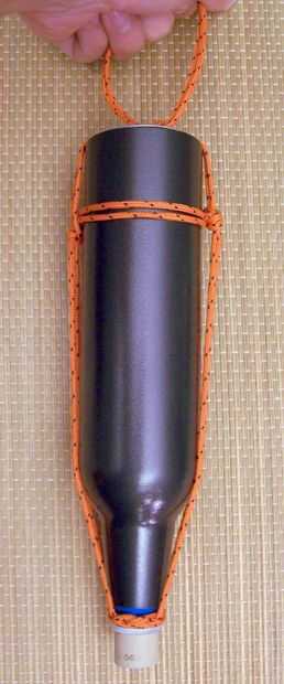 Me gusta el look del acento coloreada cable corriendo por los lados de la botella y el hecho de que la botella se cuelga de la cinta boca abajo. Agrega a su singularidad.