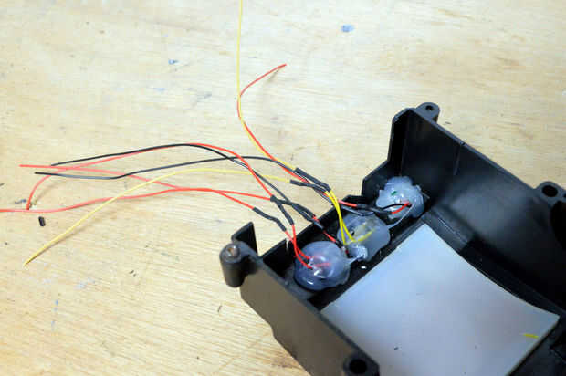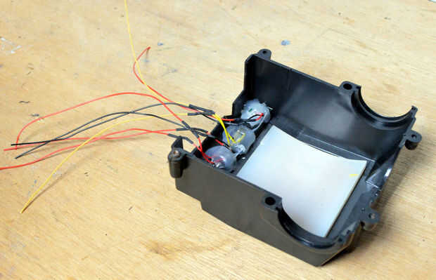 1. en primer lugar usted tendrá que decidir dónde colocar los interruptores táctiles, micrófono etc.. A pesar de que hizo las cosas un poco difíciles al efectuar el cableado, decidí añadir a la parte delantera del robot. Taladre los orificios necesarios para los 2 interruptores, LED y micrófono.