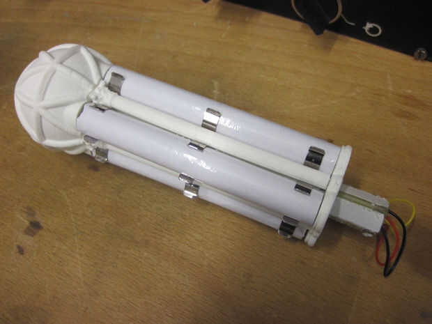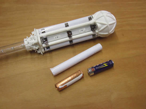 Después de insertar el bloque batería el mango se puede completar con adición de la parte inferior y fijación con tornillos. El acrílico tubo con sus LEDs se conecta con los cables y (después de comprobar si todo funciona) está ocupada con epoxi. Un capitel adicional se pega encima de la conexión para ver mejor.
