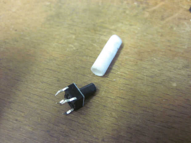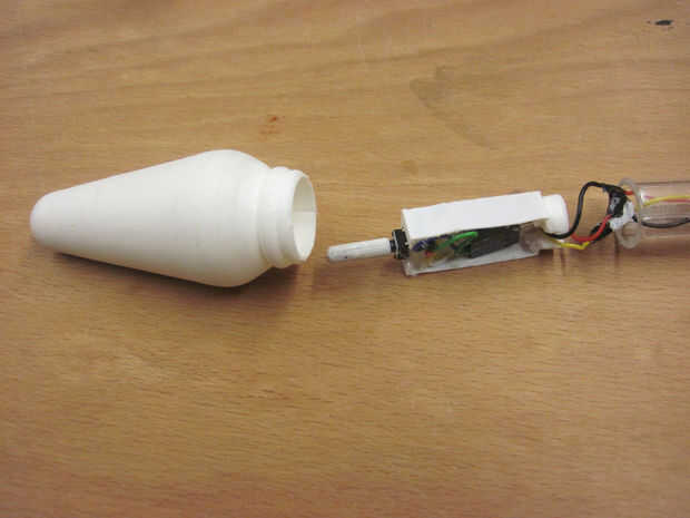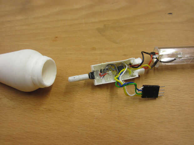 Dentro de una caja pequeña en la punta un attiny se utiliza actualmente como controlador para los LEDs. Nada extravagante, simplemente el ejemplo básico de Adafruit para la enlights de la biblioteca de Neopixel los LEDs. Un botón con una punta pequeña adicional en la parte superior se puede utilizar en el futuro para aclarar la caña cada vez que el palillo golpeó el suelo.
