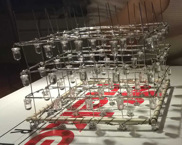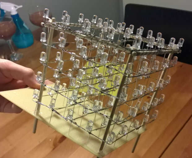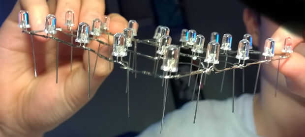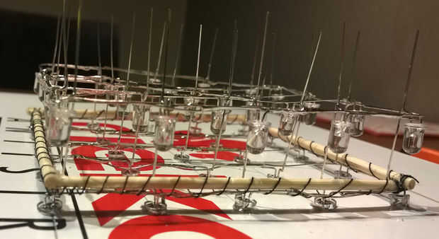 Nos miró fijamente hacia fuera por decidir cómo los diodos deben configurar el cubo real. Nos dimos cuenta que si tomamos el ánodo (pata más larga +) y doblarla hacia afuera y luego hacia abajo, podremos poner diodos uno encima del otro.