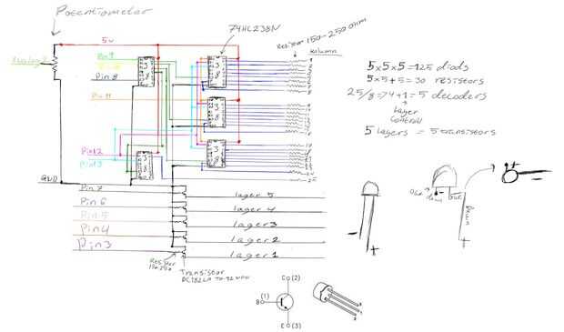 void setup() {<br> // decoder 1-4 in signals pinMode(13,OUTPUT); pinMode(12,OUTPUT); pinMode(11,OUTPUT); //decoder 5 in signals pinMode(10,OUTPUT); pinMode(9,OUTPUT); //E3 pinMode(8,OUTPUT); digitalWrite(8,HIGH); // Layers pinMode(7,OUTPUT); pinMode(6,OUTPUT); pinMode(5,OUTPUT); pinMode(4,OUTPUT); pinMode(3,OUTPUT); } // This method will auto-shift to the right decoder for the diode. // This will simplify the rest of the code. To light a diod simply choose layer and column! void diod(int column, int layer) { PORTD = B00000001 << layer+3; int temp = column/8; PORTB = ((column << 3) + (temp << 1)+1); } void loop() { example(); } void example() { for (int i = 0; i < 5; i++) { for (int j = 0; j < 25; j++) { diod(j,i); delayMicroseconds(150); // 150microseconds delay to let the diod actually light up! } } }