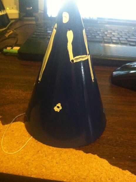Después de hacer los agujeros, aerosol pintado azul porque es mi color de escuela. Después de dejarlo seco, pinté el diseño real blanco porque es mi otro color de escuela. Es tan simple como eso.