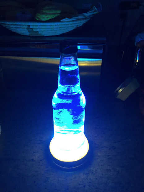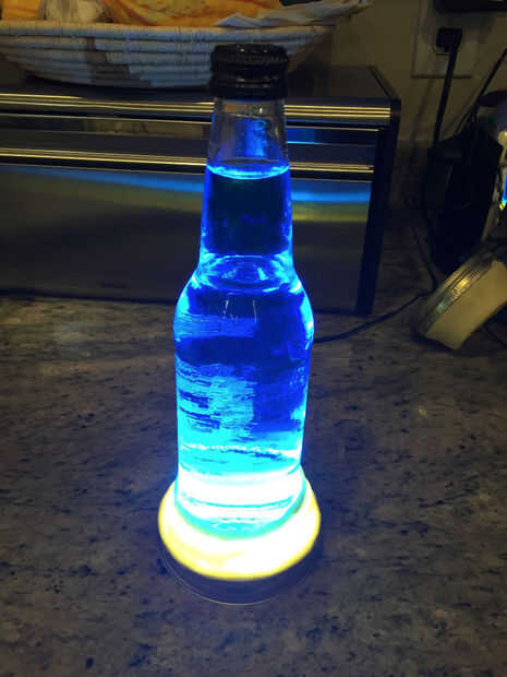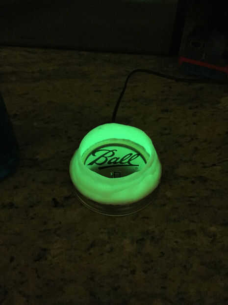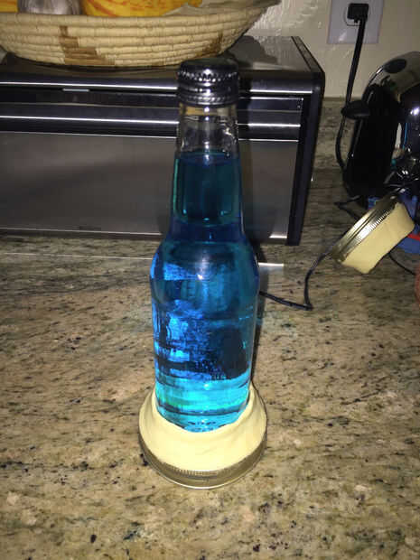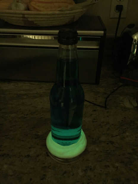¿Porqué está Sculpey brilla en la oscuridad? Bueno, Blick no tenía ningún azul transparente en la acción (orden web solamente), y el resplandor en la oscuridad tiene el beneficio añadido que se comporta como un material orgánico irradiado. Continúa brillando durante un rato después de haber extraído la Nuka Cola Quantum en el stand. :)