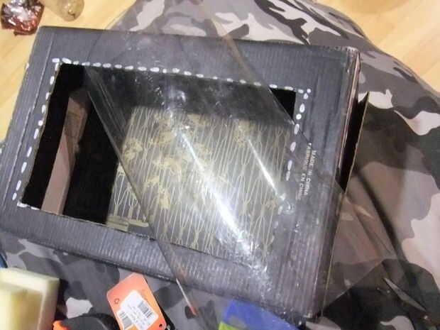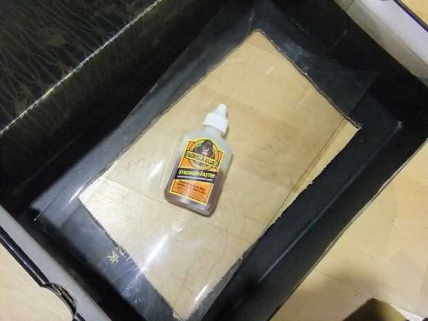 Poner pegamento gorila sobre los bordes dentro de la caja y colocar el rectángulo de plástico, luego usé algunos pesos para mantener en su lugar el plástico