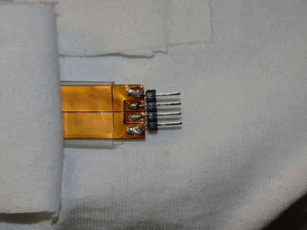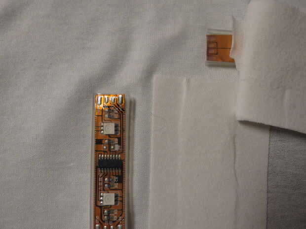 Coloque algún papel en el extremo de la tira para no quemar la camiseta mientras se suelda. Estos pueden soldarse en el frente o la espalda de cualquier manera no. Pero asegúrese de hacer un seguimiento de los 5v + 5v-, DI, CI líneas deben coincidir. Es importante que al final pongo hacia fuera se conecta a la línea de entrada!! (Ver foto B)