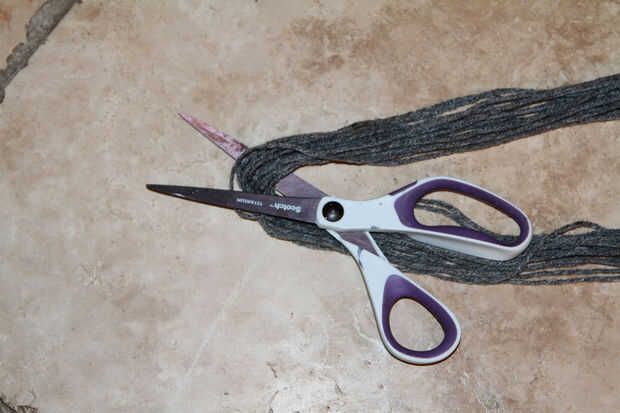 Desenrolle todo madeja de hilado a mano en un lazo grande. Usted necesitará tener lazo muy grande por lo que su cabello será tiempo suficiente para arreglar. Trate de mantener su lazo bastante uniforme pero no necesita ser perfecto. Una vez que se desenrolla la madeja entera corte de un extremo (sólo uno). Nota: Para estas fotos desenrollado apenas una pequeña parte de la madeja que terminará con una mucho mayor cantidad de hilo desenrollado.