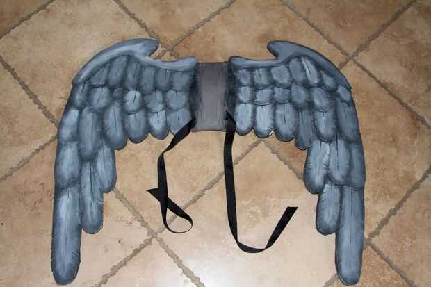 Espuma de artesanía tipo encontrará en las hojas. Encontré grandes gris hojas de espuma de artesanía en el pasillo de la manía por un dólar cada uno. Compré 5 y eso fue suficiente para recortar suficientes plumas para el exterior de mis alas. Sólo pinté las plumas en el interior ya no visto como mucho. Pero si desea cubrir dentro y fuera de las alas tendrá 10 piezas.