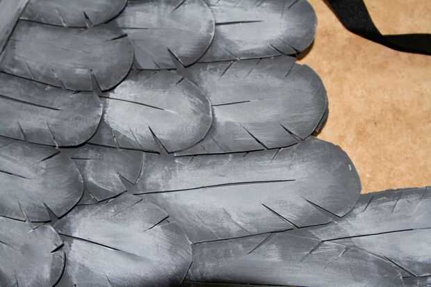 He utilizado 5 hojas grandes (alrededor de 12 x 18 pulgadas) de arte de la espuma de hojas como la foto de arriba. He encontrado unos gris por un dólar en una tienda de artesanía. Sólo cubrí la parte exterior de las alas. Puede que necesite comprar más dependiendo de lo grande de hojas encontrará y cuán grande son tus alas.