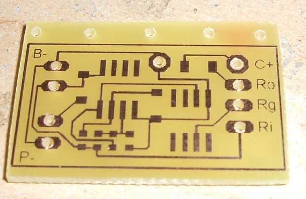Una vez tengas la placa desarrollada, coloque las ilustraciones del tablero hacia arriba en un tanque de cloruro férrico. Una hora sin calor o burbujeo es sobre la cantidad de tiempo, pero Compruebe periódicamente. Cuando se hace, lávela con agua, luego exponerlo a la luz otra vez con ninguna máscara y tira de resistir con el desarrollador. Arena o corte el sobrante de la baterial, pero deje 1/4" a un lado. Con un 1/32" pedacito de taladro, perfore los orificios. También, perforar una secuencia de agujeros en el espacio sobrante como se muestra. Usaremos esto para coser el regulador en la bolsa en un futuro paso.