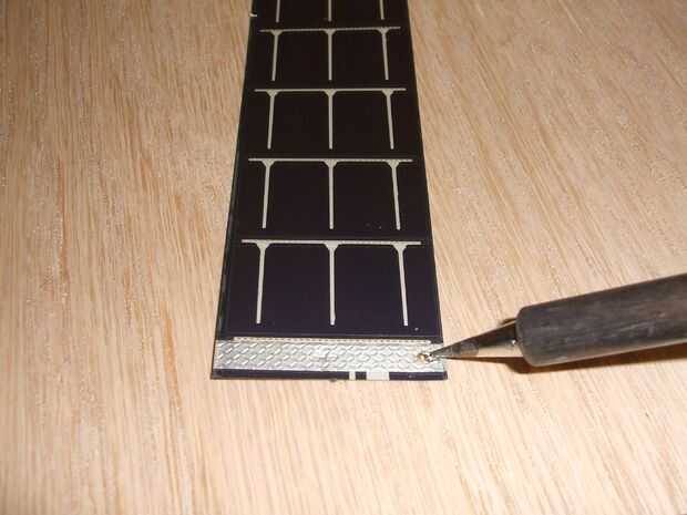 Conectar todas las tres células solares en paralelo. Las células han plateado lengüetas de conexión, pero estos están cubiertos en film de plástico. Con el soldador, fundir un agujero pequeño en la película de plástico en cualquier lugar que necesita un alambre de la soldadura. La película de plástico se derrite, y entonces la ficha será fácilmente soldadura. Recuerde que usted está trabajando en plástico y tenga cuidado de no utilizar demasiado calor. También Coloque dos soldadura lenguados en la parte inferior de la unidad de celda, para conectar a los cables del cargador cuando llegue el momento. Con un multímetro, mida la polaridad de la salida de las células solares y observarlo. La polaridad en los cuadros finales de este Instructable es correcta, pero es siempre una buena idea para medir.