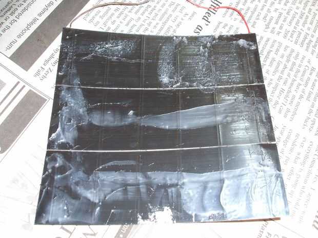 Ahora que te vinculación las células solares en la bolsa. Ejecutar una capa de Sil-Net alrededor del borde exterior de la parte inferior (lado de plata) de cada célula. Inserte un pedazo de cartón en la bolsa para hacer una superficie plana y rígida y luego alinear y colocar las células en la superficie. Es una buena idea para colocar las células por encima de la bolsa de la cremallera, porque a pesar de que son flexibles para las células solares son todavía rígidos en comparación con el SilNylon.