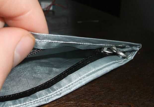 Ahora es el momento para revisar tu trabajo. Abrir la cremallera e invierta la bolsa por la abertura de la cremallera. Usted debe terminar con un 5.5x5.5 "bolsa con una capucha que cubre la cremallera. Si parece correcto, coloque 1/2" a las dos esquinas superiores como se muestra en el cuadro de las correas. Coser por la costura ahora adentro hacia fuera, porque esa área es 6 capas gruesas en lugar de dos.