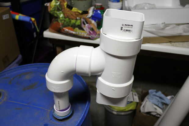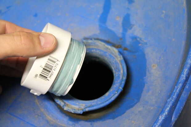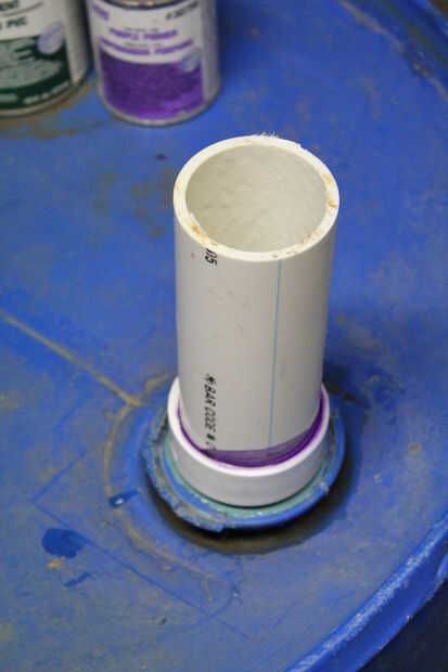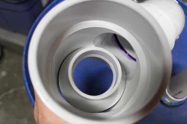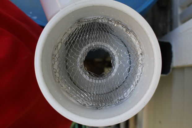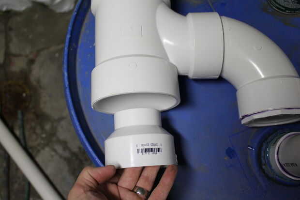 Para empezar la sección de pegado, he aplicado pasta TFE rosca a las roscas del adaptador macho de PVC de 2" y había insertado en la rosca fina en la parte superior del cañón. Luego cebe y pegar la pequeña sección de tubería de PVC de 2" en el adaptador macho. Tomar el buje de reducción de 2" y primer y pegar en el extremo correspondiente del codo de 90 grados. Cebe y pegar el codo en la salida de 3" de la t sanitaria. Asegúrese de que la t está al revés de la instalación de fontanería normal. La curva permite un mejor flujo en el cilindro. Utilice el mismo sellador de grado marino para pegar lo 3 "X 1-1/2" acoplamiento en la parte de abajo de la t sanitaria. Hay un pequeño hueco entre estas piezas por lo tanto, el uso de sellador sobre cemento de PVC. Tomé una sección de la pantalla del canal y había formado en forma de embudo que se abre en el 1-1/2" agujero del acoplamiento. Esto es para mantener hojas y escombros de los canalones del cañón. El paso final es introducir dos 3 "X 4" X 4" adaptadores de bajada de agua en cualquiera de los extremos de la t sanitaria.